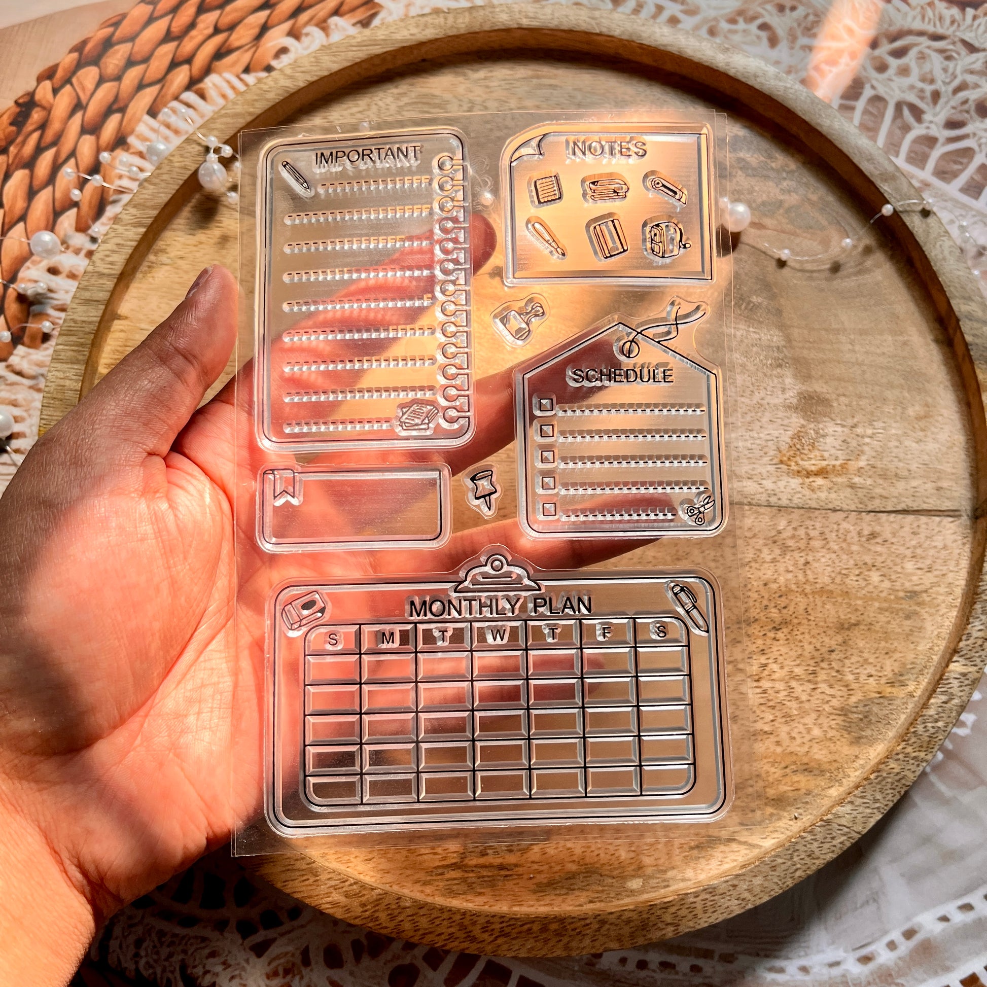 Transform your planner pages into a daily adventure with these charming transparent stamps! Perfect for journaling enthusiasts and DIY planner lovers, this calendar series stamp brings instant personality to your entries. Whether you're marking special dates, adding decorative flourishes, or organizing your schedule, these versatile stamps make planning feel less like a chore and more like creative play. The transparent design lets you see exactly where your stamp lands before pressing down, ensuring perfectly placed impressions every time. Ideal for scrapbooking, bullet journaling, or customizing your planner spreads with a touch of whimsy.