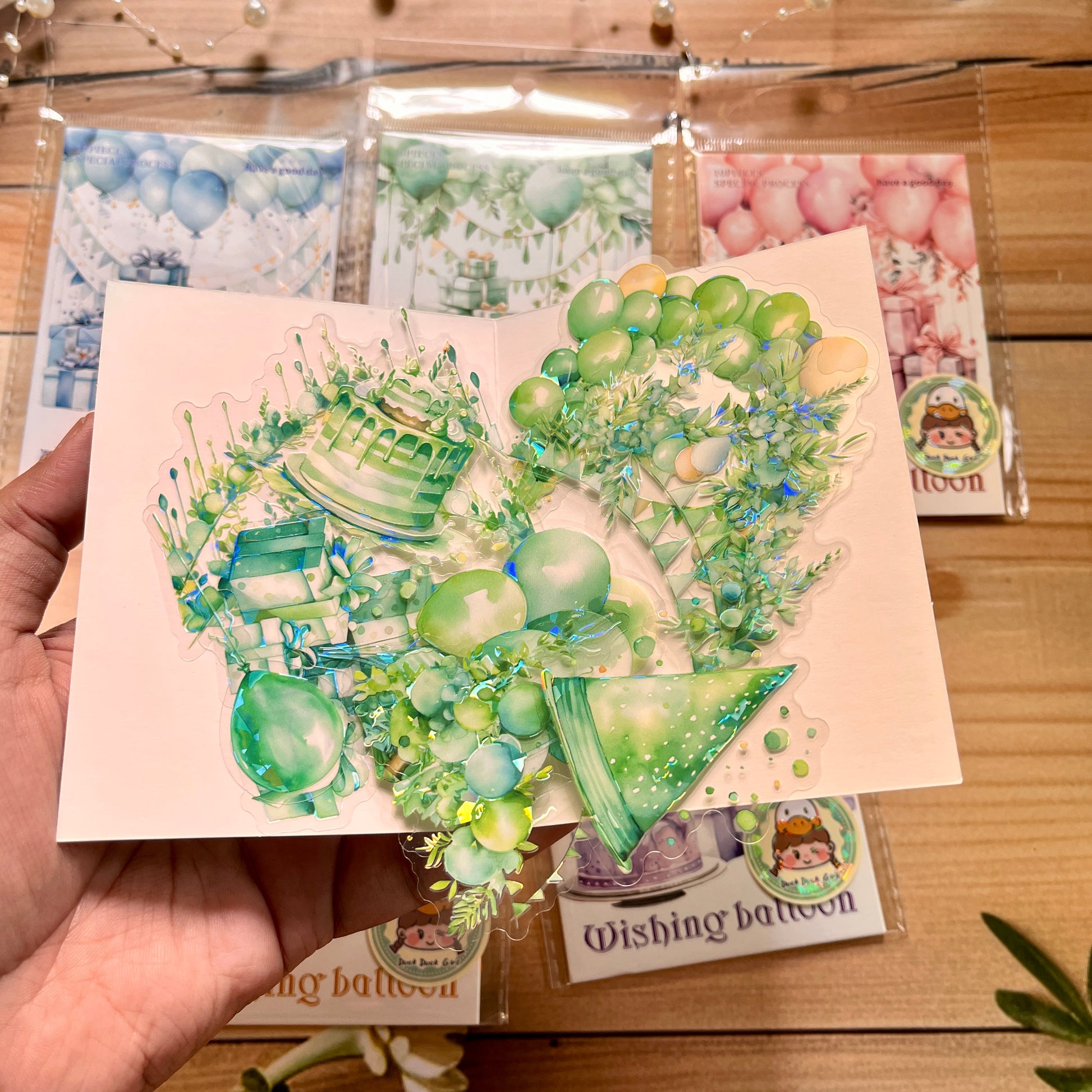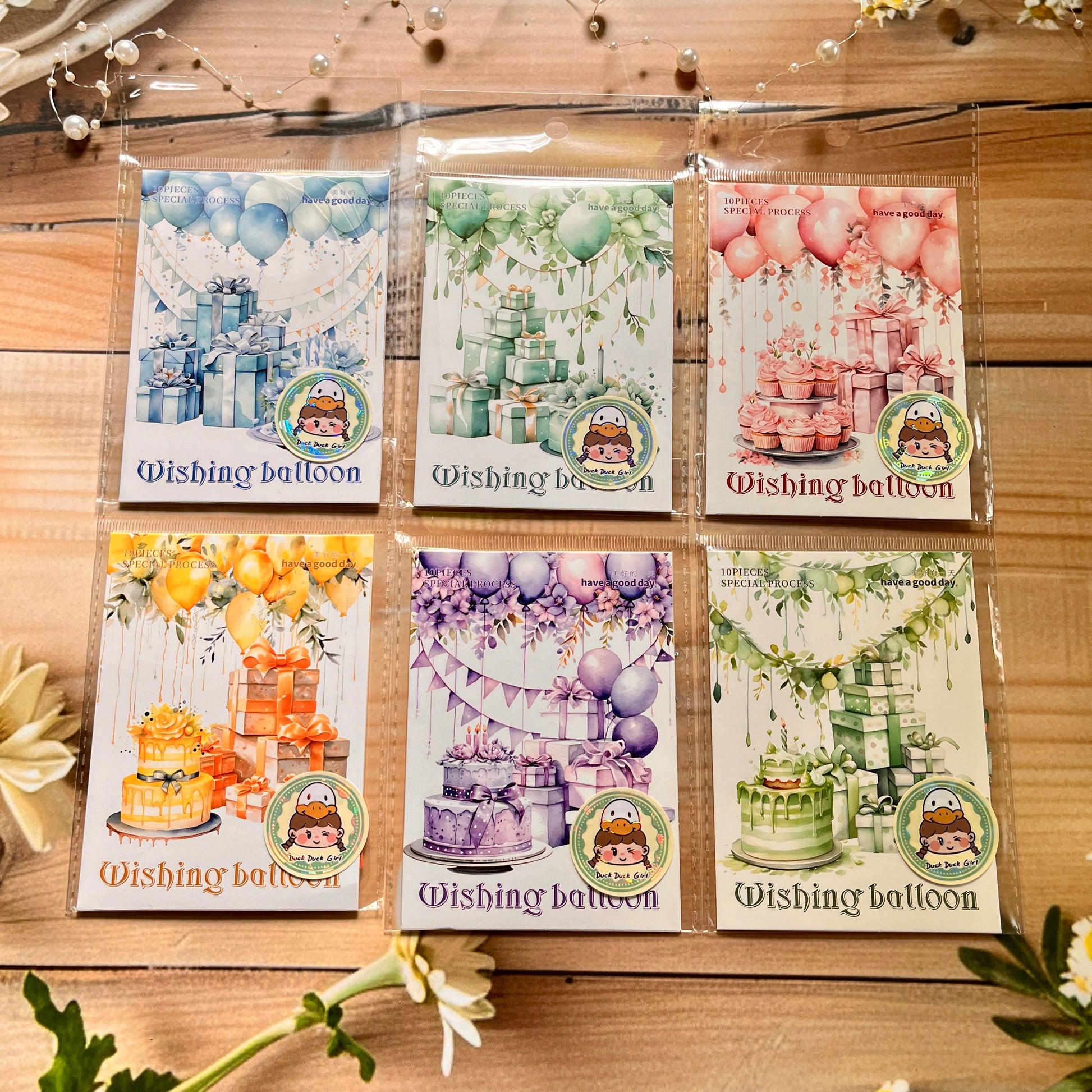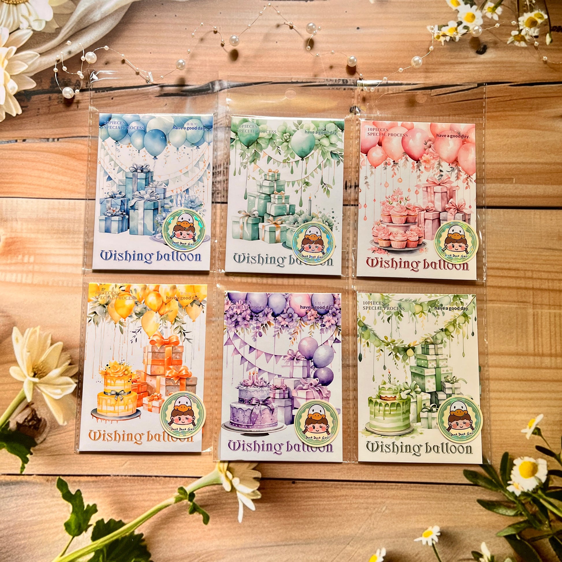 Experience the joy and excitement of a party with our Wishing Balloon series Shell Light decorative stickers! Featuring retro balloon designs, gifts, and cakes, these stickers are perfect for adding a cheerful and warm touch to your scrapbook projects. Whether it's for a birthday or holiday celebration, these stickers will bring a festive atmosphere to any design. Get your pack of 10 stickers now and let your creativity soar!