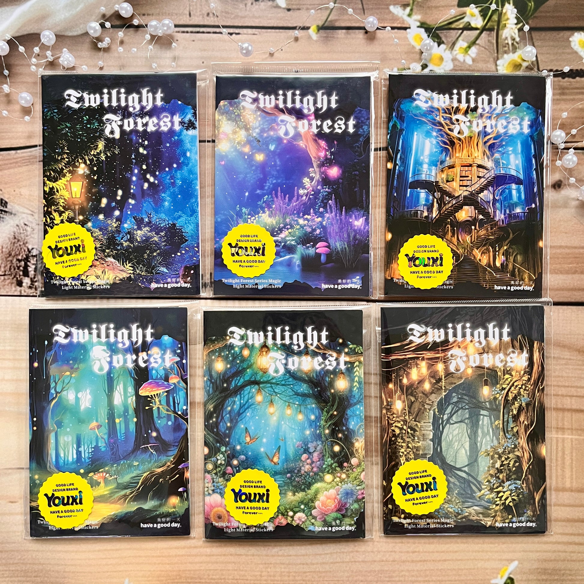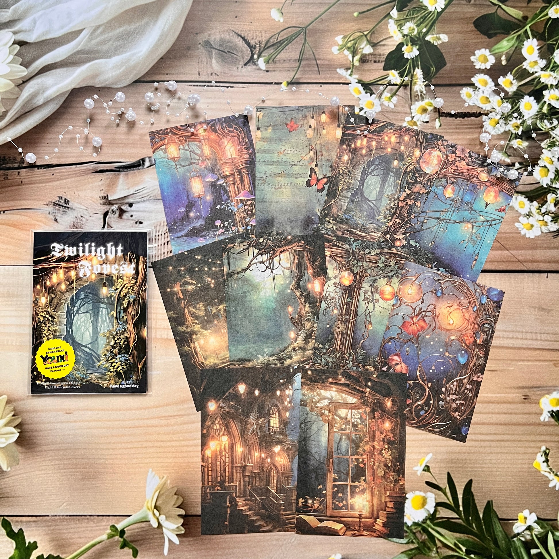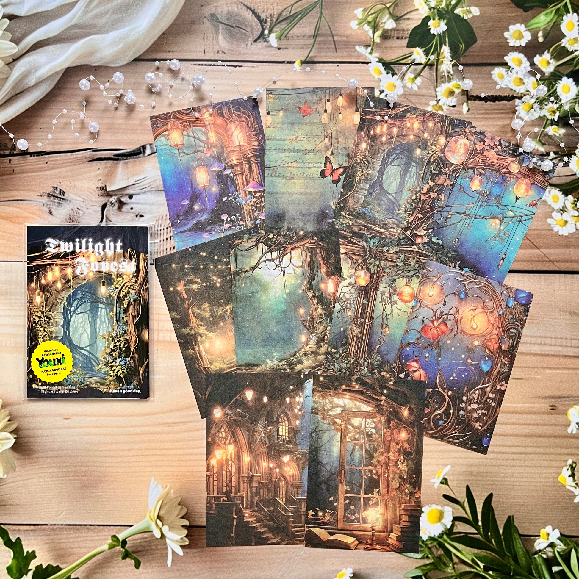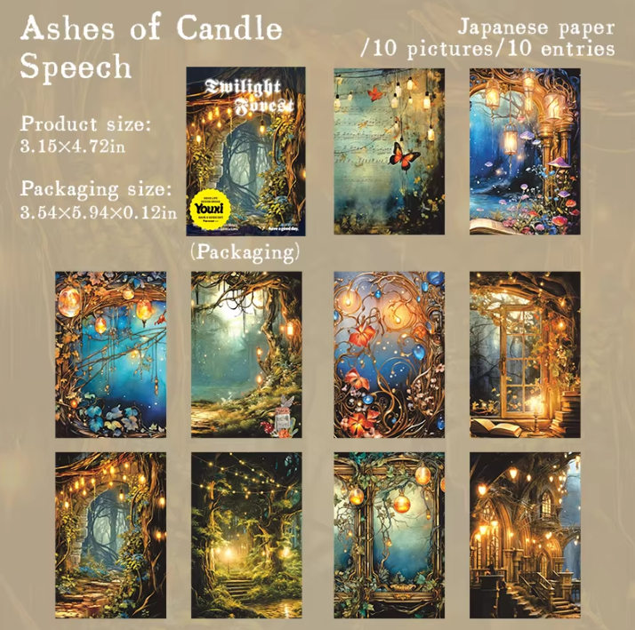 This set includes 10 sophisticated Twilight Forest Series lighting-themed stickers, perfect for enhancing your scrapbooking projects. Each sticker captures the enchanting ambiance of a twilight forest, adding depth and elegance to your creative layouts. Ideal for those seeking to infuse their crafts with a subtle, atmospheric charm.
