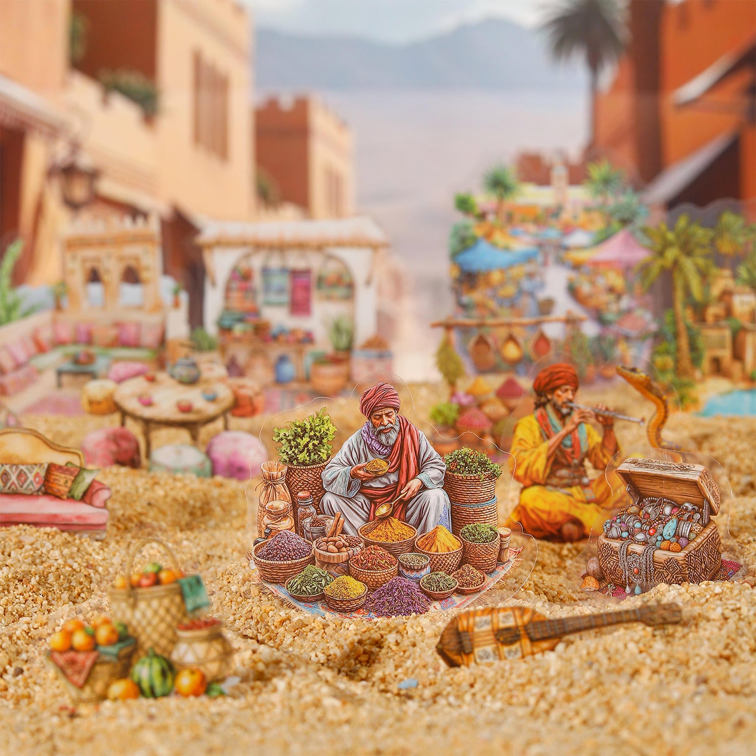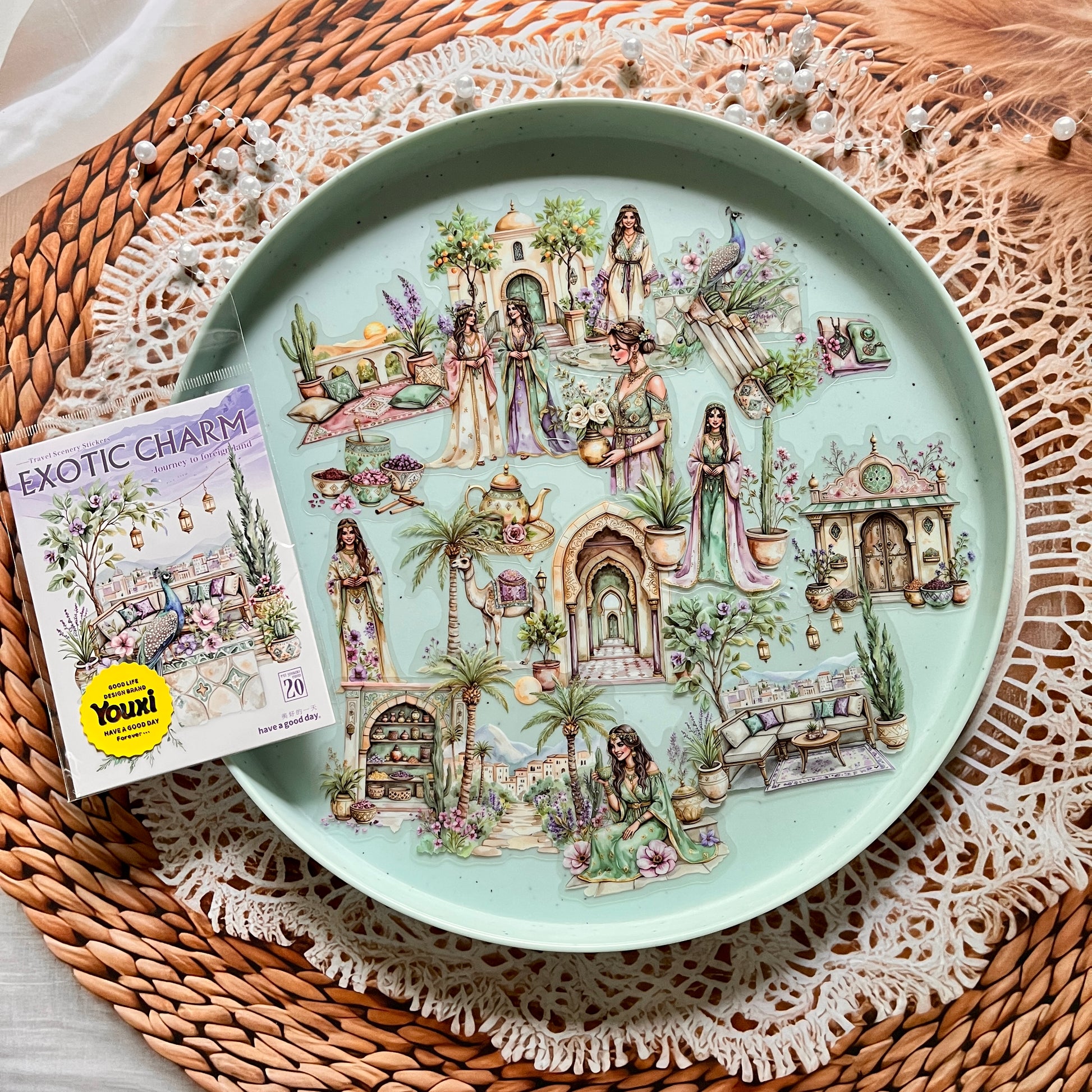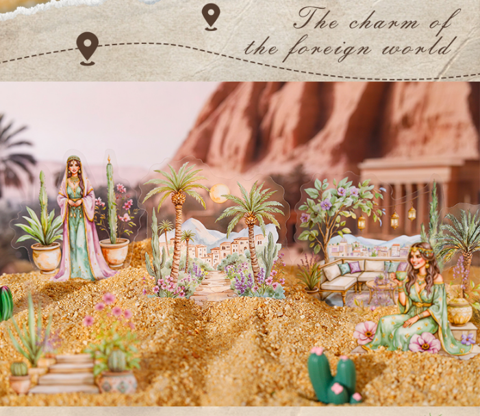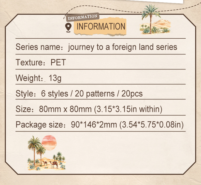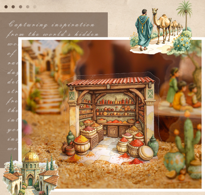 These 20 Silk Road-themed PET stickers feature elegant designs of camels, deserts, palaces, and peacocks. Printed on transparent material, they add a seamless, vintage touch to your journals and scrapbooks. Perfect for creating sophisticated travel or historical-themed layouts with rich cultural storytelling.