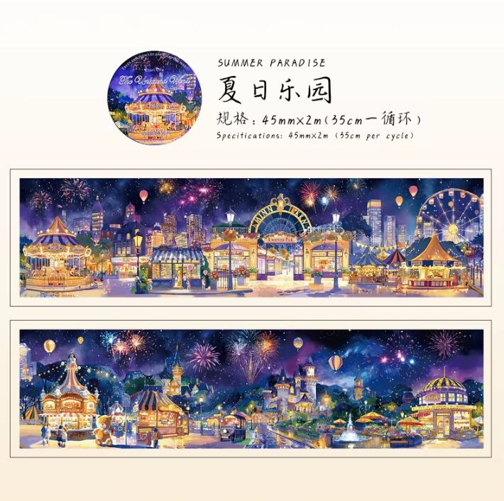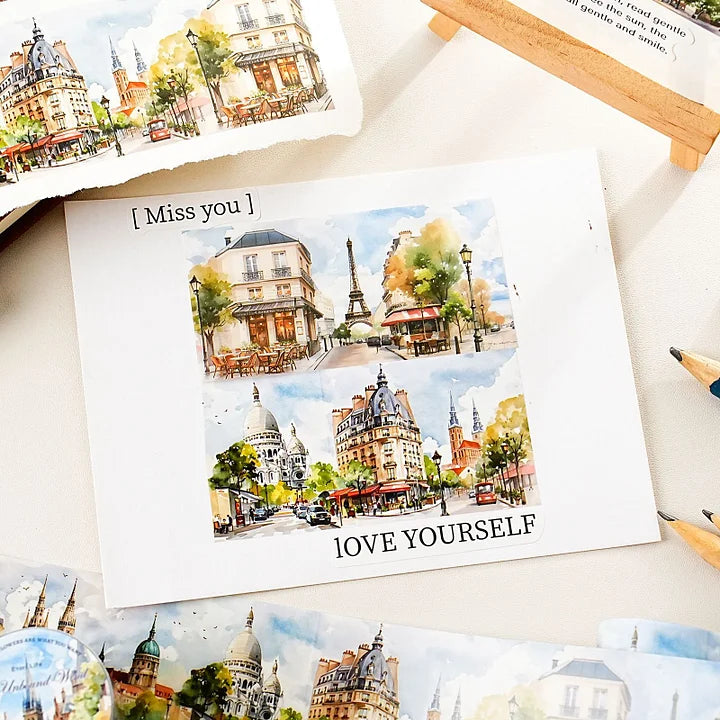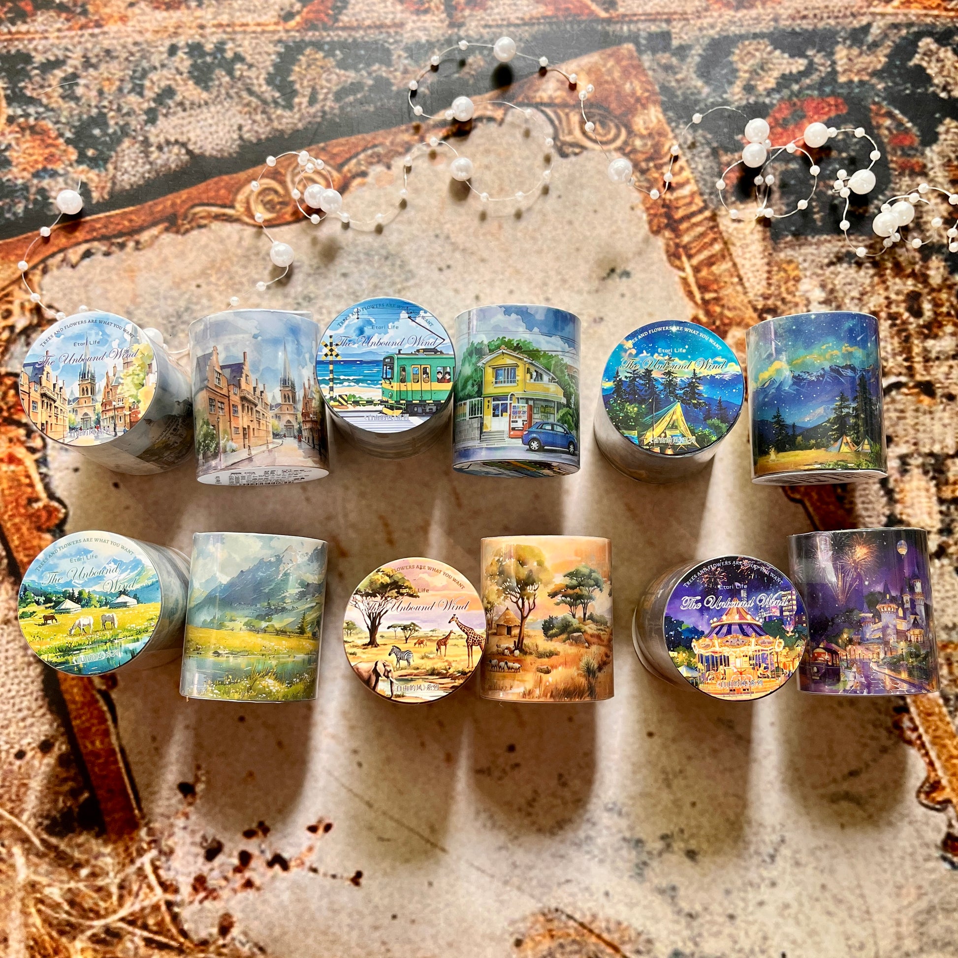 This scenic PET tape brings stunning landscapes right to your creative projects. Featuring dreamy seaside towns, vibrant city views, magical fireworks, and wild African savannas, it's perfect for adding visual storytelling to scrapbooks, journals, and planners. The transparent, durable material layers beautifully for extra depth and charm. Transform every page into an adventure! ✨