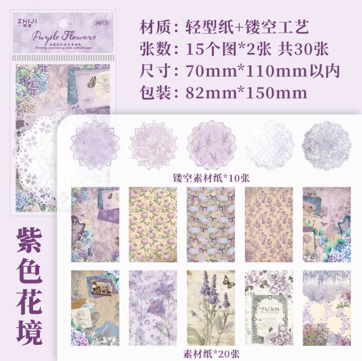The 30pcs Know More Memory Series Material Paper pack is the perfect addition to your scrapbooks and journals. Featuring 30 unique purple flower decorations, this pack will elevate your artistic creations. Crafted with quality material, it ensures long-lasting use and provides endless possibilities to express your creativity.