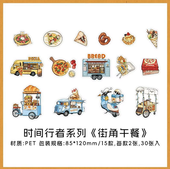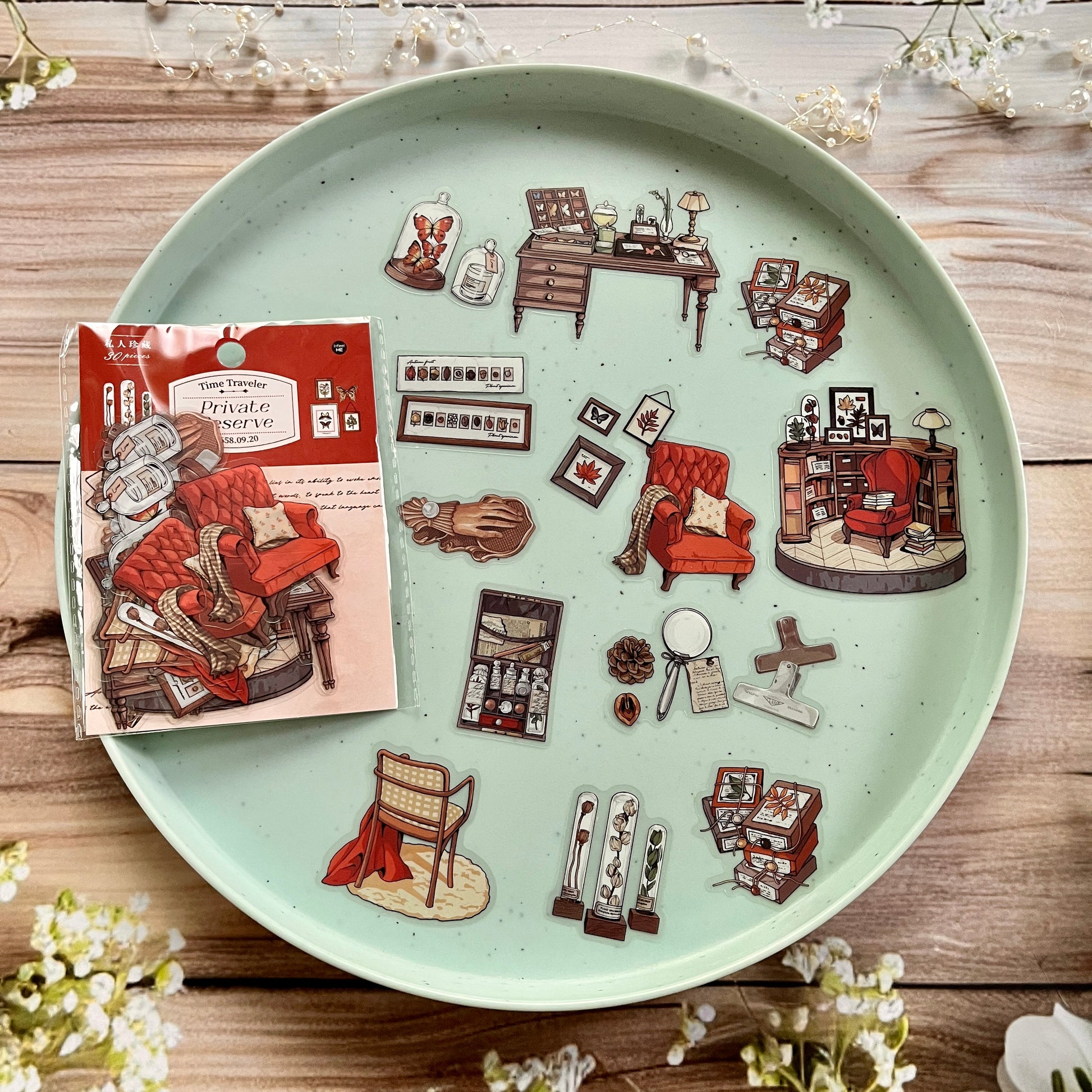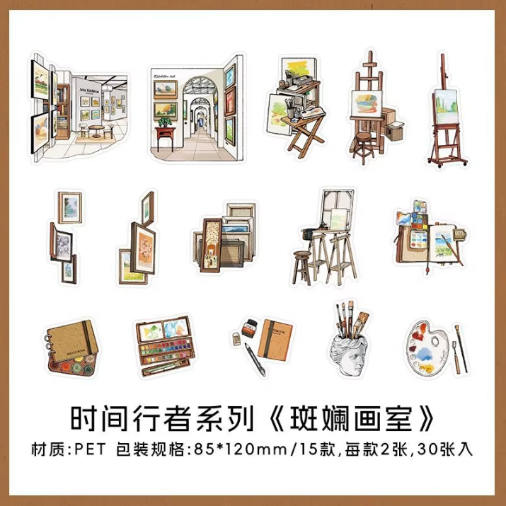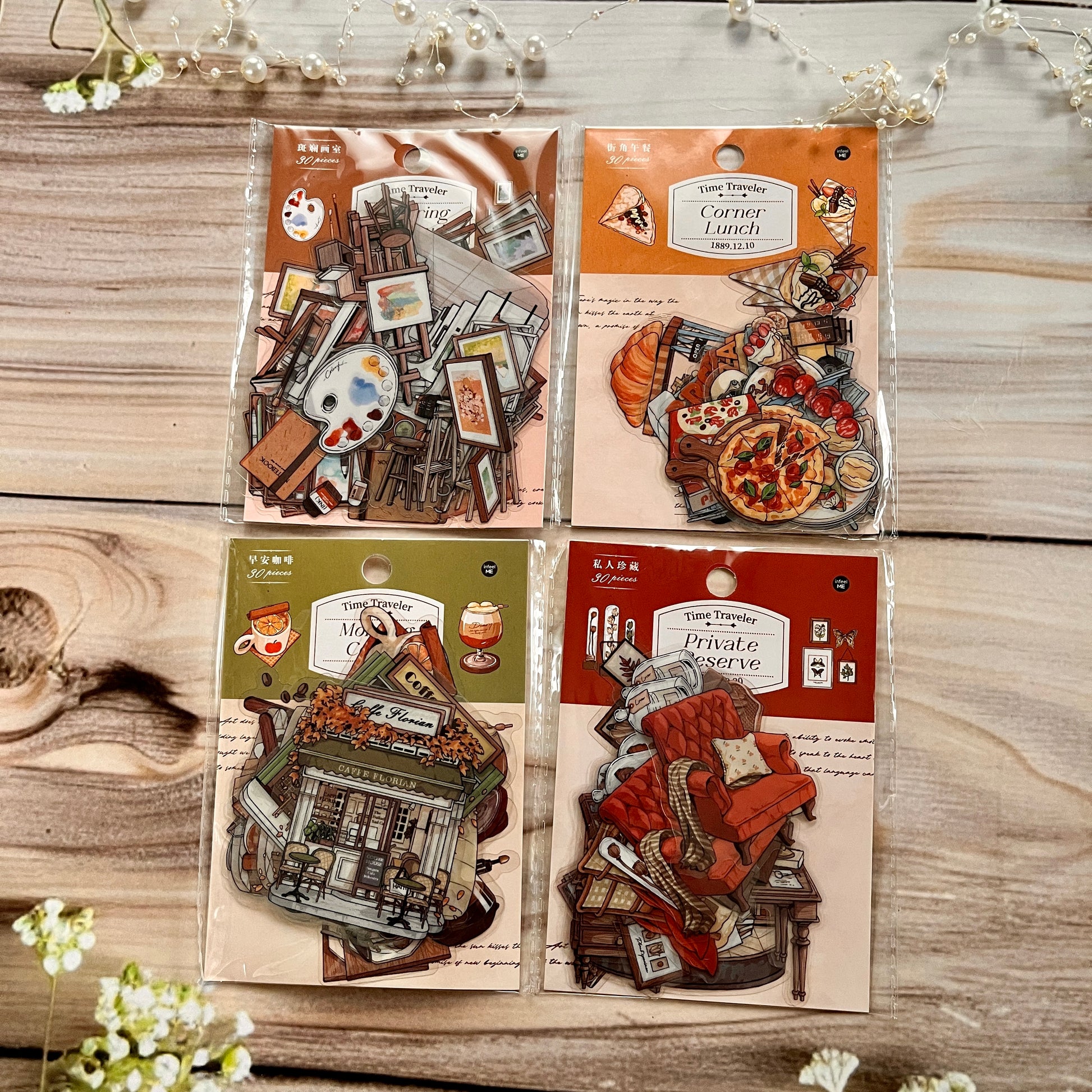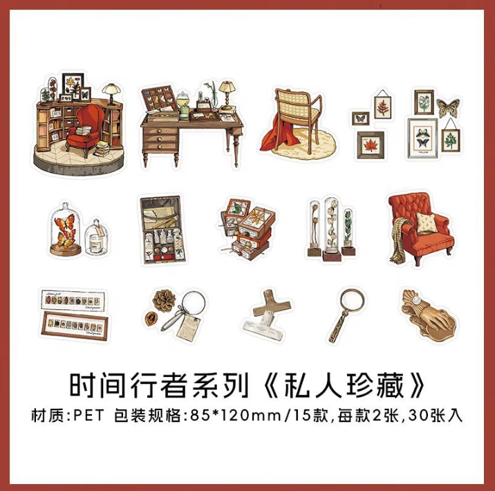 Introducing our 30pcs Timewalker Series Light Retro Decoration Material Pet stickers! Perfect for journaling and scrapbooking, these stickers feature daily life objects in a retro style. Add a touch of nostalgia and creativity to your daily life with these high-quality and unique stickers.