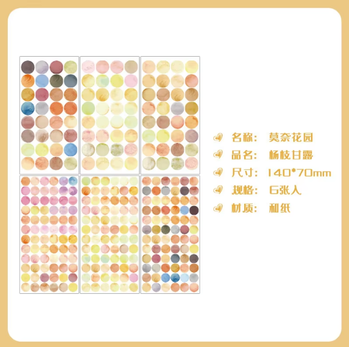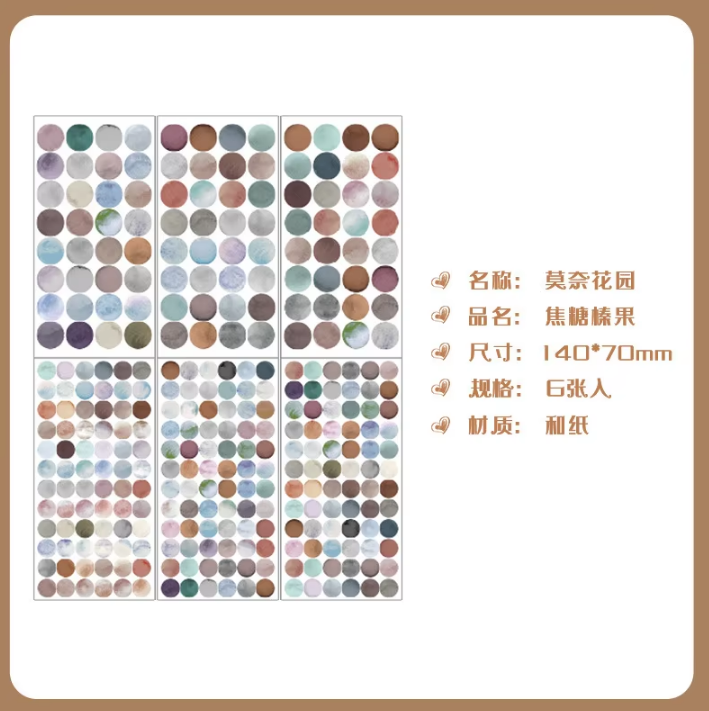 Enhance your journaling experience with this set of 6 Morandi-colored dot stickers. Featuring a refined palette inspired by classic Morandi tones, these stickers add subtle elegance and organization to your notes, planners, or creative projects. Perfect for those who appreciate understated beauty and thoughtful detail in their stationery.