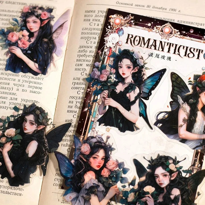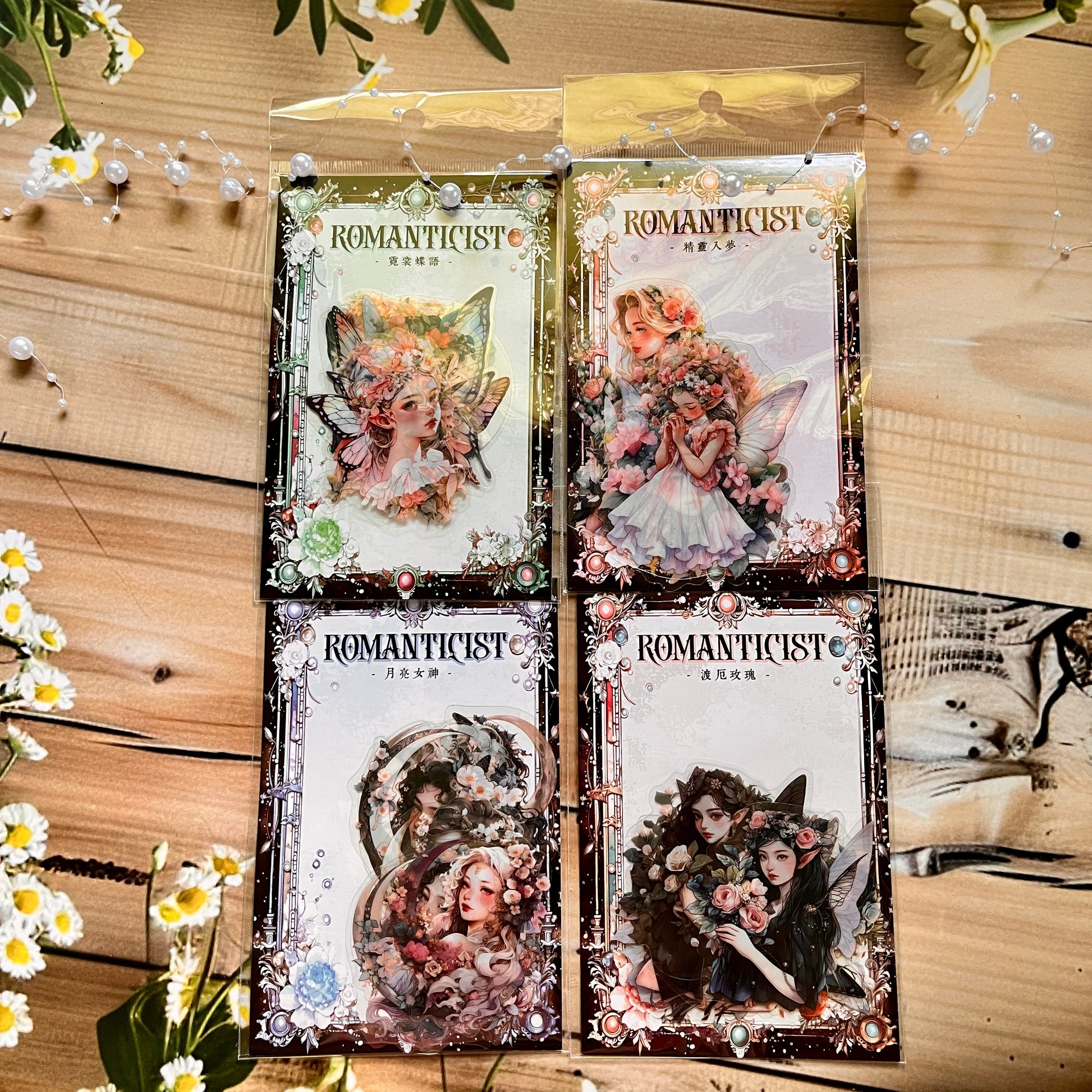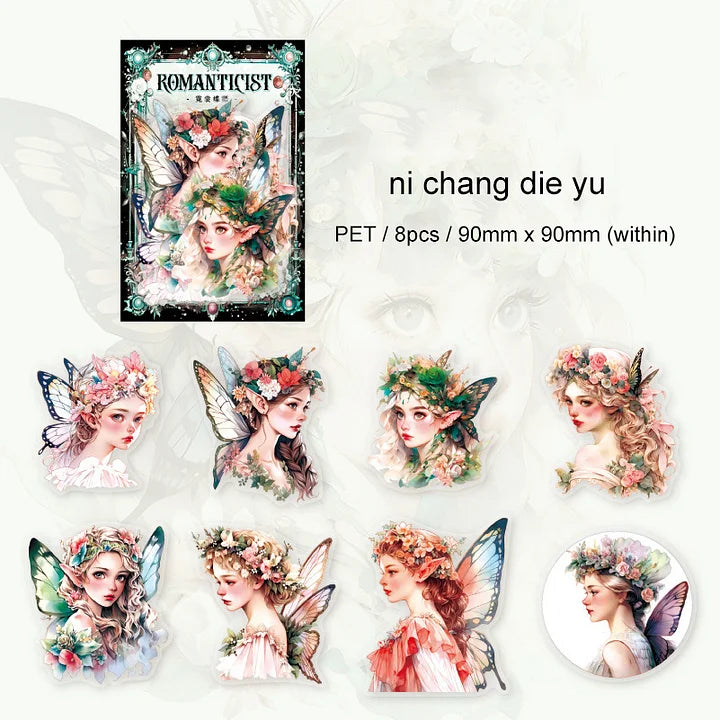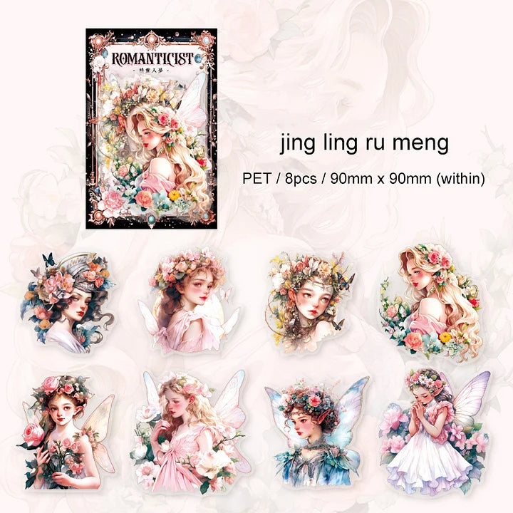 Introducing the 8 Pcs Romantic Believer Series Vintage Character Flower PET Sticker, the perfect addition to any scrapbook. Let these beautiful and vintage character stickers inspire your creativity and add a touch of romance to your projects. With 8 unique designs, you'll have endless possibilities to bring your vision to life.