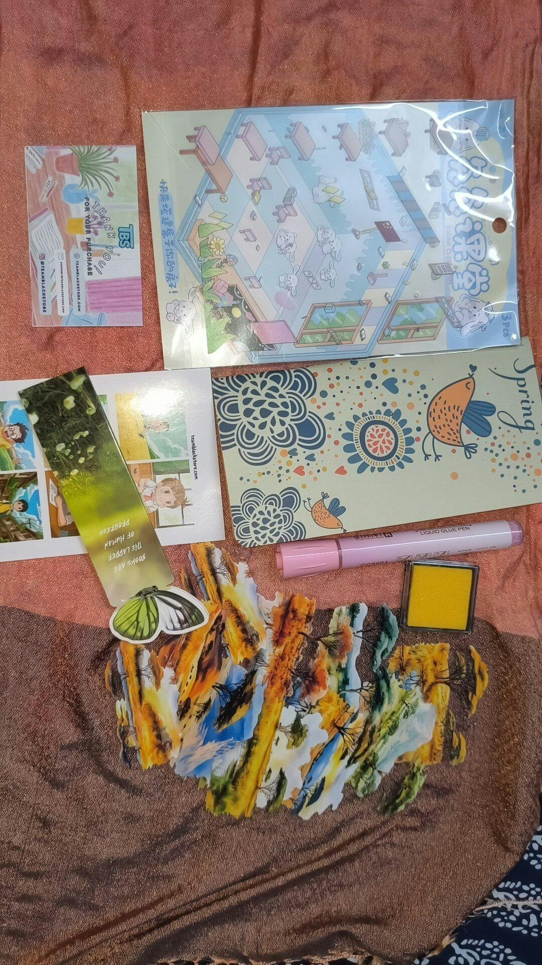 Absolutely loved the mystery balls! The quality of the stickers are excellent. The landscape sticker set is fr one of the cutest things I ever have. The notebook? Absolute perfection. Easy to carry and honestly has been my fav so far ❤ I ordered the bookmark separately, (which is also amazing) I have a strong obsession with green so it's perfect!
